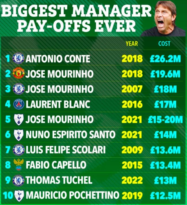 토트넘은 감독 위약금으로 4,150만~4,650만 파운드(약 665~745억 원)를 지출한 바 있다. 과거 조세 무리뉴 경질(1,500~2,000만 파운드), 누누 에스피리투 산투(1,400만 파운드), 마우리시오 포체티노(1,250만 파운드)에게도 위약금을 건넨 바 있다.