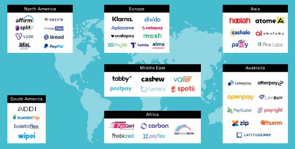 대표기업으로는 스웨덴의 크려나(Klarna), 호주의 애프터페이(Afterpay), 미국의 어펌(Affirm) 등이 있다. 미국 대표 빅테크 애플도 애플페이 레이터라는 BNPL 서비스를 준비하고 있다.