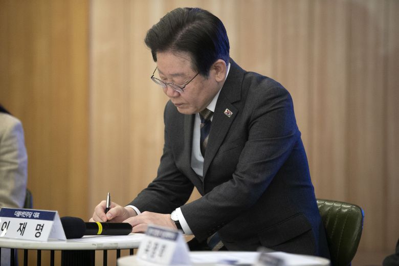 이재명 더불어민주당 대표가 21일 오전 서울 강남구 팁스타운 S6에서 열린 미국 SVB 사태 대응 벤처·스타트업 업계 간담회에서 참석자들의 발언을 들으며 메모하고 있다. /뉴스1