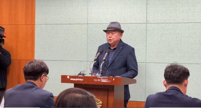 ▲윤석열 대통령 부인 김건희 여사가 과거 유흥주점에서 일했다는 이른바 '쥴리 의혹'을 제기한 안해욱(74) 전 대한초등학교태권도협회장이 22일 전북도의회에서 기자회견을 열고 전주을 국회의원 재선거 출마를 선언하고 있다. ⓒ연합뉴스