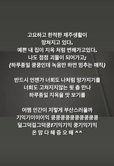 22일 최예슬은 개인 SNS를 통해 “고요하고 한적한 제주 생활이 망쳐지고 있다. 예쁜 내 집이 지옥처럼 변해가고 있다”고 글을 올렸다.