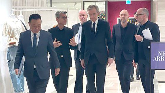 21일 오후 서울 서초구 서초동 신세계백화점 2층으로 아르노 회장이 들어서자 각 매장 관계자들이 나와 환영 인사를 건넸다. 아르노 회장은 장녀 델핀 아르노 디올 최고경영자(CEO), 둘째 아들 알렉상드로 아르노 티파니앤코 부사장, 피에트로 베카리 루이비통 최고 경영자 등과 함께 불가리·티파니앤코·디올·루이비통·벨루티 등 LVMH 산하 브랜드를 둘러봤다.