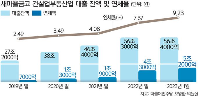 지난해 새마을금고가 건설·부동산업 관련 대출을 많이 늘렸고, 연체율도 상승한 것 역시 불안감을 키운다. 더불어민주당 오영환 의원이 행정안전부로부터 제출받은 자료에 따르면 지난해 12월 말 기준 새마을금고가 건설업과 부동산업 기업에 대출해준 잔액은 56조3000억원으로 2019년 말(27조2000억원) 대비 두 배 넘게 급증했다. 새마을금고의 토지담보대출이나 공동대출이 크게 늘었다는 의미다. 부동산시장이 얼어붙기 시작한 2021년에도 대출 규모가 46조4000억원까지 늘어난 바 있다.