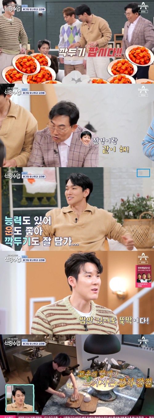 이승철은 “진경이랑 같이 해”라고 거들어 웃음을 안겼다. 이규한은 한술 더 떠 “아니 왜 그 사람이랑 하냐. 우리랑 하자”라고 너스레를 떨었다. 이규한은 요리 실력까지 완벽한 김재중에 “능력도 있어 운도 좋아 깍두기도 잘 담가”라고 질투해 웃음을 자아냈다.
