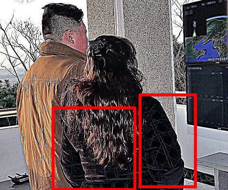 북한 김정은(왼쪽)이 지난 16일 딸 김주애와 '괴물 ICBM '인 화성-17형 시험 발사 훈련을 참관하고 있다. 이날 김주애가 입은 검은 후드 재킷에 프랑스 명품 크리스찬 디올의 상징적인 패턴 무늬(빨간 사각 실선)가 눈에 띈다. /조선중앙통신