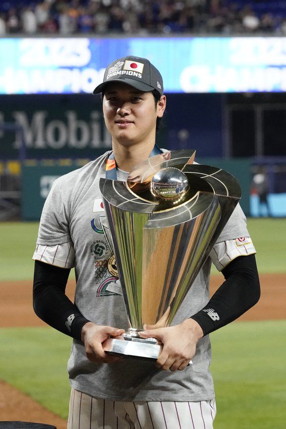 오타니는 첫 출전한 올해 WBC에서도 두 개의 칼을 휘둘렀다. 타자로는 타율 0.435(23타수 10안타)에 1홈런 8타점 9득점을 기록했다. 투수로는 3경기에서 2승 1세이브 평균자책점 1.86을 기록했다. WBC 올스타 트로피 2개(투수·지명타자)를 거머쥐었다. 당연히 MVP도 오타니의 차지였다. 오타니는 “정말 꿈꾸던 순간이다. 일본 선수들과 함께 해 즐거웠다”고 말했다.