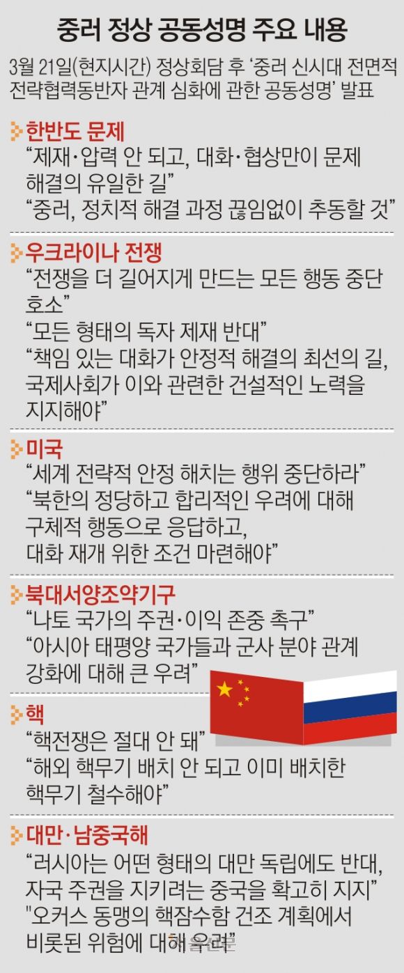 시진핑 중국 국가주석과 블라디미르 푸틴 러시아 대통령이 미국을 향해 “세계의 안정을 해치는 행위를 중단하라”며 ‘반미 연대 강화’를 공식 선언했다. 대만 문제와 우크라이나 사태를 두고 서로의 입장을 지지하는 동시에 미국의 압박에 맞서고자 경제·군사 협력도 강화한다고 밝혔다. 그러나 두 정상은 전 세계가 주목한 중국산 무기의 러시아 지원 여부에 함구했고 우크라이나 전쟁의 구체적 해결 방안도 내놓지 못했다.
