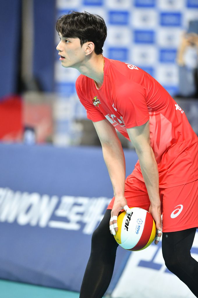 임성진이 22일 열린 우리카드와의 준플레이오프에서 서브를 시도하고 있다. 사진=KOVO 제공 |