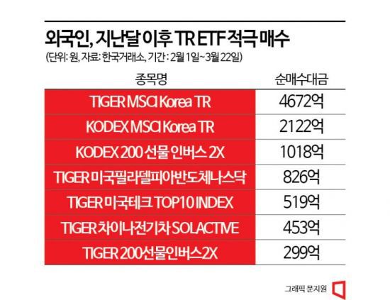 외국인 투자자들이 지난달 이후 토탈리턴(TR) 상장지수펀드(ETF)를 집중 매수하고 있다. 국내 증시에서 ‘팔자’ 행렬을 이어가는 가운데서도 TR ETF만큼은 적극적으로 사들이고 있다.