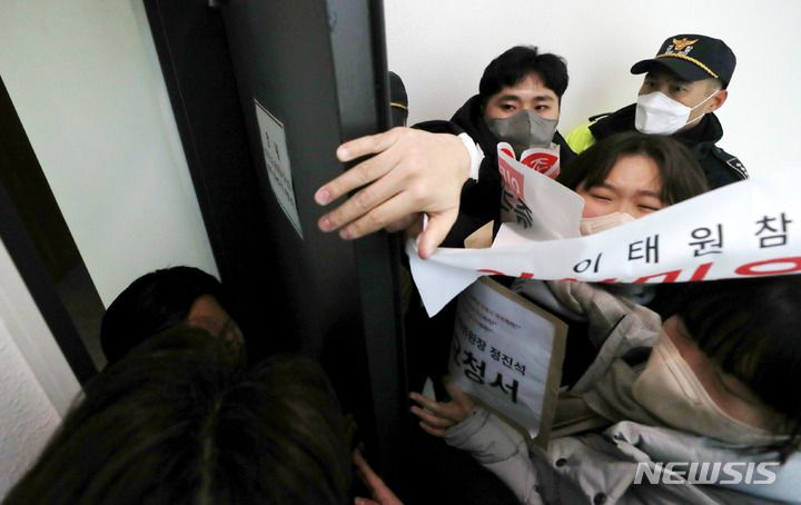 [서울=뉴시스] 추상철 기자 = 한국대학생진보연합(대진연) 회원들이 지난해 12월16일 오후 이태원 참사 국정조사 정상화' 촉구와 정진석 비상대책위원장과의 면담을 요구하며 서울 영등포구 여의도 국민의힘 중앙당사 진입을 시도하고 있다. 2022.12.16. scchoo@newsis.com
