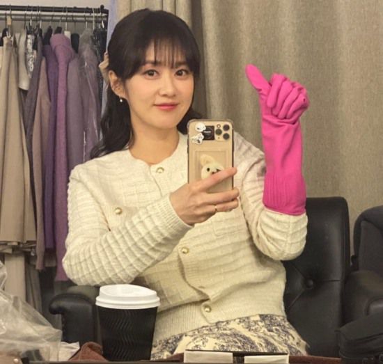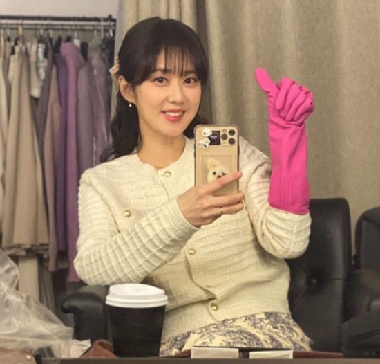 공개된 사진 속 장나라는 드라마 촬영 중 대기실에서 고무장갑을 손에 낀 채 팬들에게 셀카로 근황을 전하고 있는 모습. 결혼 후 더욱 어려진 동안 비주얼이 보는 이의 감탄사를 자아낸다