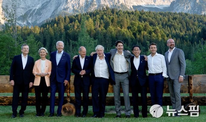 [엘마우성 로이터=뉴스핌] 주옥함 기자 = 마리오 드라기 이탈리아 총리(왼쪽부터), 우르줄라 폰데어라이엔 유럽연합(EU) 집행위원장, 조 바이든 미국 대통령, 올라프 숄츠 독일 총리, 보리스 존슨 영국 총리, 쥐스탱 트뤼도 캐나다 총리, 기시다 후미오(岸田文雄) 일본 총리, 에마뉘엘 마크롱 프랑스 대통령, 샤를 미셸 EU 정상회의 상임의장이 26일(현지시간) 독일 바이에른주 엘마우성에서 열린 7개국(G7) 정상회의에서 기념사진을 찍고 있다. 2022.06.27.wodemaya@newspim.com |