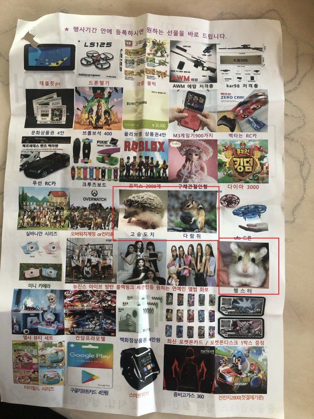 A 씨가 올린 학원 전단에는 드론, 인형 장난감, 연예인 화보 등 학생들이 좋아할 만한 상품들을 증정한다는 내용이 있었다. 상품 목록에는 살아있는 고슴도치, 다람쥐, 햄스터가 포함돼 있었다. 상품 설명 어디에도 피규어나 인형이라는 표현이 없었고 실제 동물들의 모습이었다.