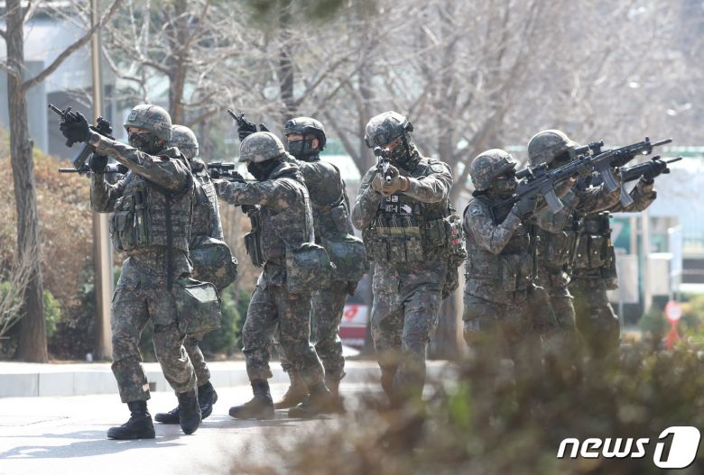 지난 20일 오후 경기 안산시에서 육군 제51보병사단 장병들이 자유의 방패(FS) 연습의 일환으로 적 드론공격 등 복합상황을 가정한 통합방위 상황조치훈련을 하고 있다. 2023.3.20/뉴스1 ⓒ News1 김영운 기자 |