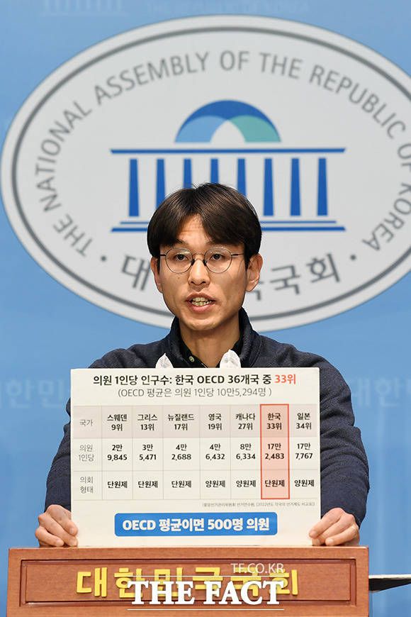 이어 "OECD 평균에 따르면, 인구 10만 명당 1명 정도 국회의원이 있는 것이 가장 좋고, 현재 우리 인구 기준에 따르면 약 500여 명의 국회의원이 있어야 한다"며 "늘어나는 국회의원은 지역 민원에 천착하는 지역구 국회의원이 아니라, 각계각층 특히 소외된 사람을 대표하는 비례대표 국회의원이어야 한다"고 덧붙였다.