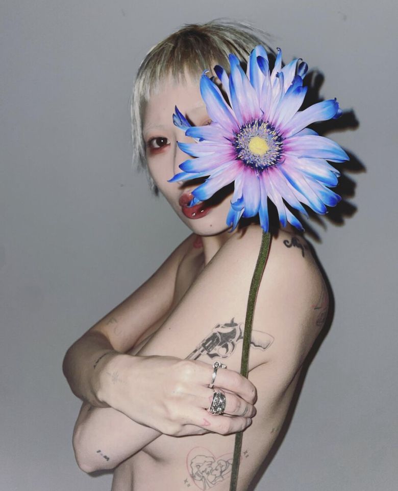 지난 22일 현아는 자신의 SNS에 꽃 이모티콘과 함께 사진 여러 장을 올렸다. 공개된 사진 속 현아는 상의를 탈의한 채 팔로만 몸을 가린 파격적인 모습으로 서 있다.