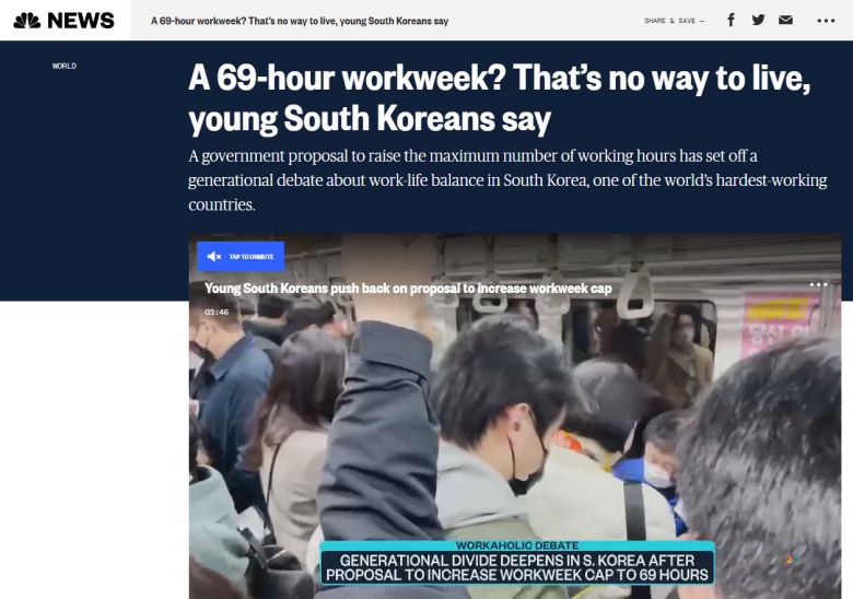 미국 NBC 방송은 22일(현지시간) "세계에서 가장 열심히 일하는 나라 중 하나인 한국에서 주당 근로시간 상한을 52시간에서 69시간으로 늘리는 방안이 젊은 노동자들의 극심한 반발을 불러 일으켰고 일과 삶의 균형에 관한 세대간 격렬한 논쟁을 촉발했다"고 보도했다.