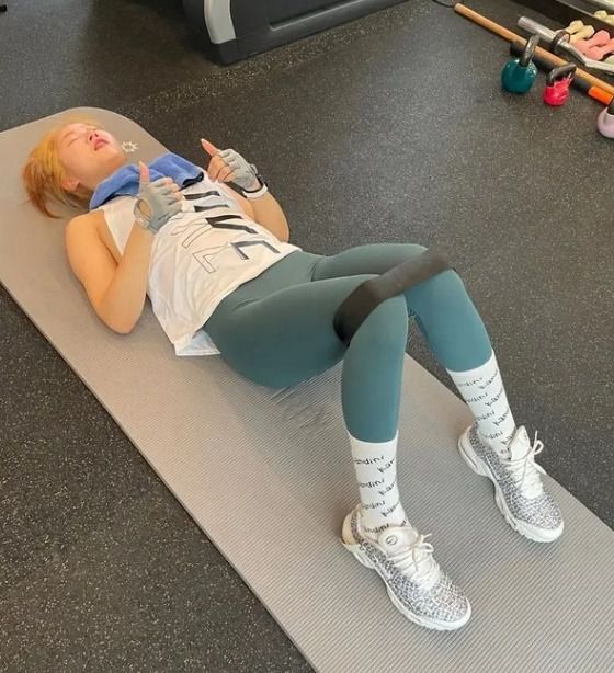 사진 속 소유는 포기하지 않고 운동을 해낸 끝에 누워서 ‘엄지 척’을 해보이고 있다.