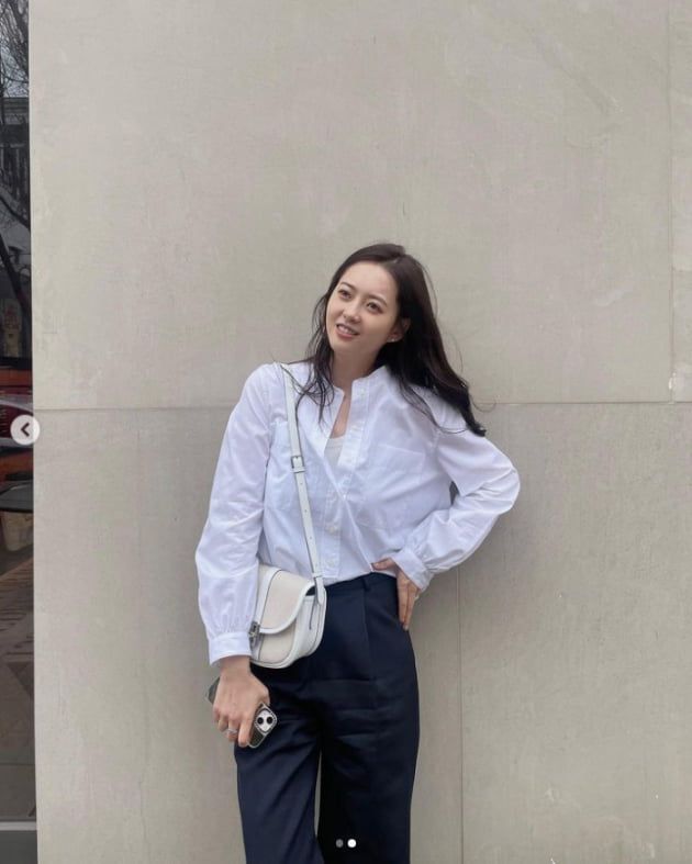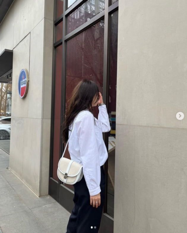 사진 속 고아라는 흰색 셔츠에 슬랙스를 착용하고 미니백을 매치한 깔끔한 룩을 보여주고 있다.