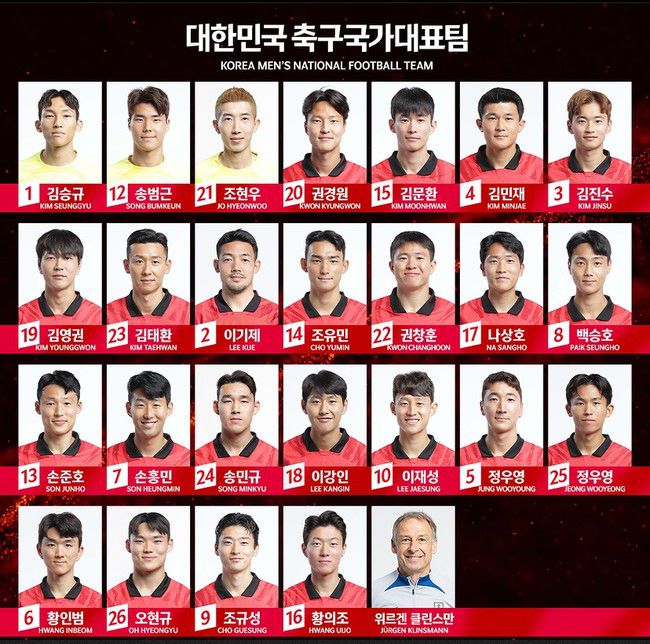 [인터풋볼] 신인섭 기자= 위르겐 클린스만 감독이 이끄는 대한민국 남자축구국가대표팀의 다가오는 2연전 등번호가 공개됐다.