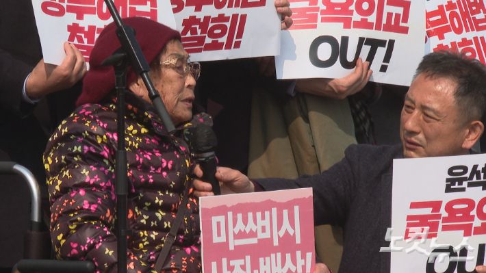 7일 일제 강제동원 피해자인 양금덕 할머니가 정부의 제3자 변제안에 대해 거부 발언을 하고 있다.