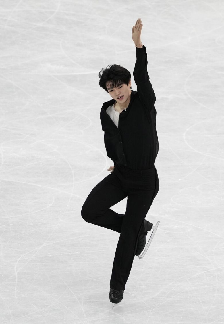 차준환(고려대)이 23일 일본 사이타마 슈퍼 아레나에서 열린 2023 국제빙상경기연맹(ISU) 피겨스케이팅 세계선수권대회 남자 싱글 쇼트 프로그램에서 연기하고 있다. 사이타마/EPA 연합뉴스 |
