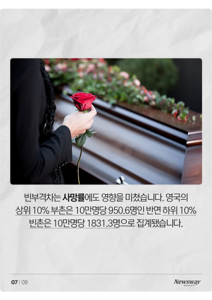 빈부격차는 사망률에도 영향을 미쳤습니다. 영국의 상위 10% 부촌은 10만명당 950.6명인 반면 하위 10% 빈촌은 10만명당 1831.3명으로 집계됐습니다.