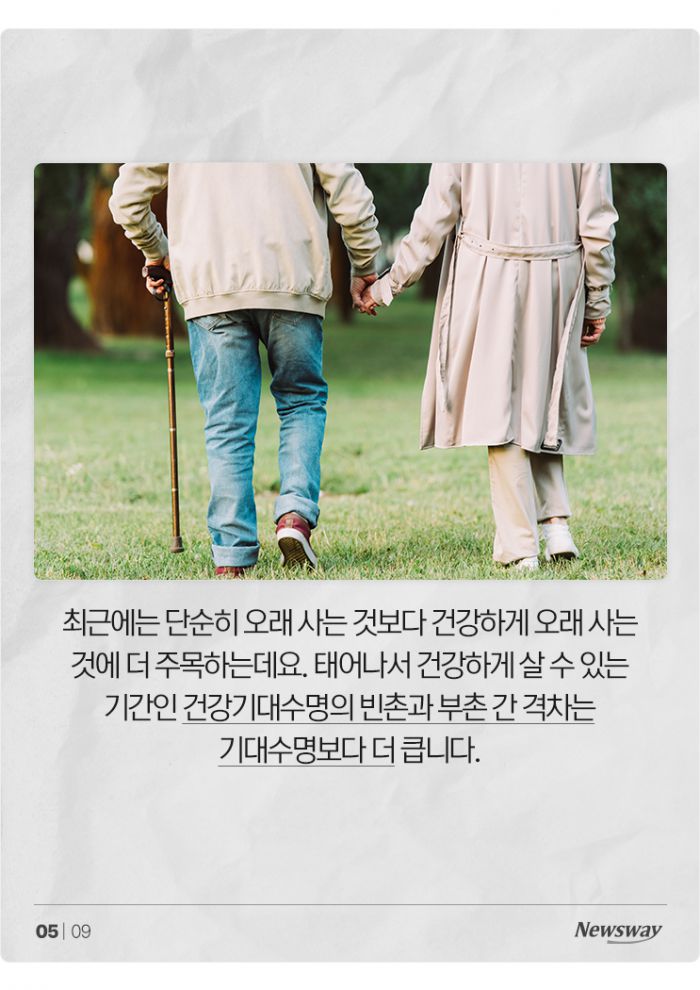 최근에는 단순히 오래 사는 것보다 건강하게 오래 사는 것에 더 주목하는데요. 태어나서 건강하게 살 수 있는 기간인 건강기대수명의 빈촌과 부촌 간 격차는 기대수명보다 더 큽니다.