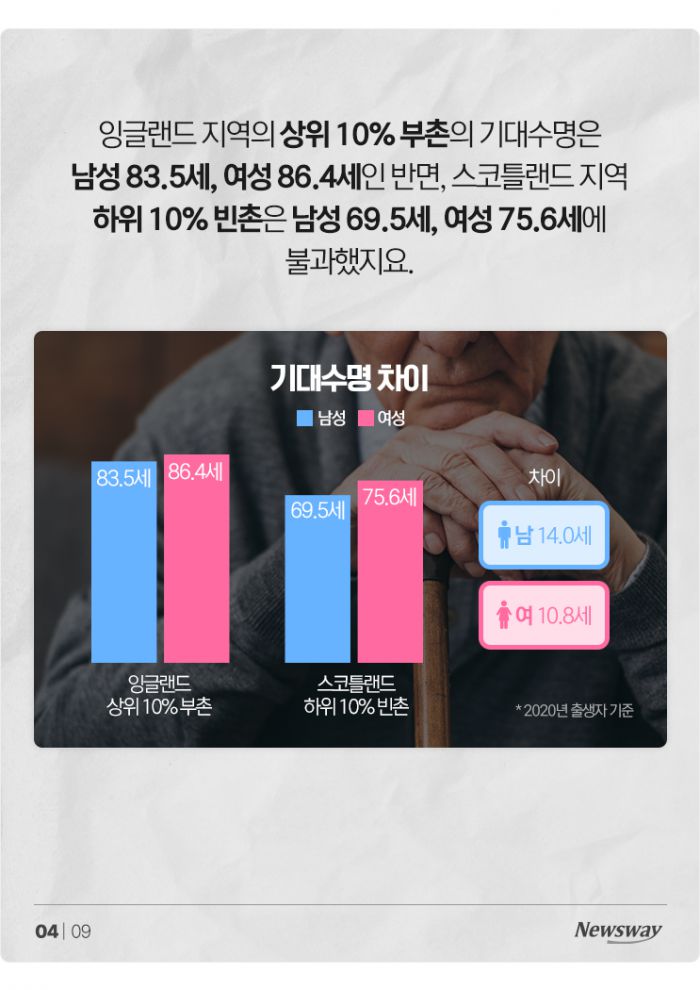 잉글랜드 지역의 상위 10% 부촌의 기대수명은 남성 83.5세, 여성 86.4세인 반면, 스코틀랜드 지역 하위 10% 빈촌은 남성 69.5세, 여성 75.6세에 불과했지요.