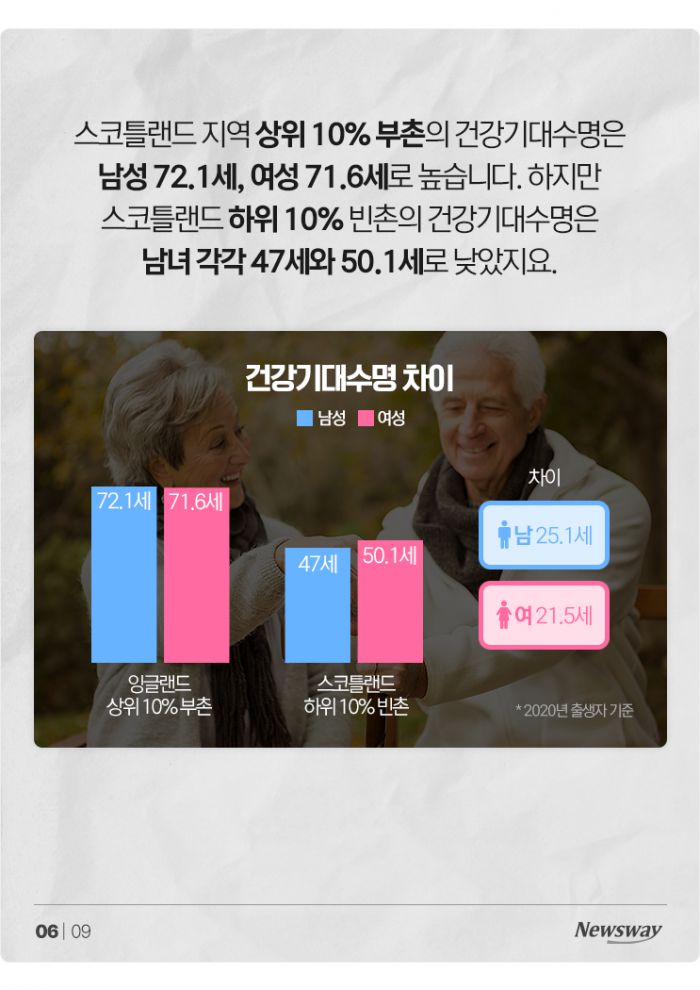 스코틀랜드 지역 상위 10% 부촌의 건강기대수명은 남성 72.1세, 여성 71.6세로 높습니다. 하지만 스코틀랜드 하위 10% 빈촌의 건강기대수명은 남녀 각각 47세와 50.1세로 낮았지요.