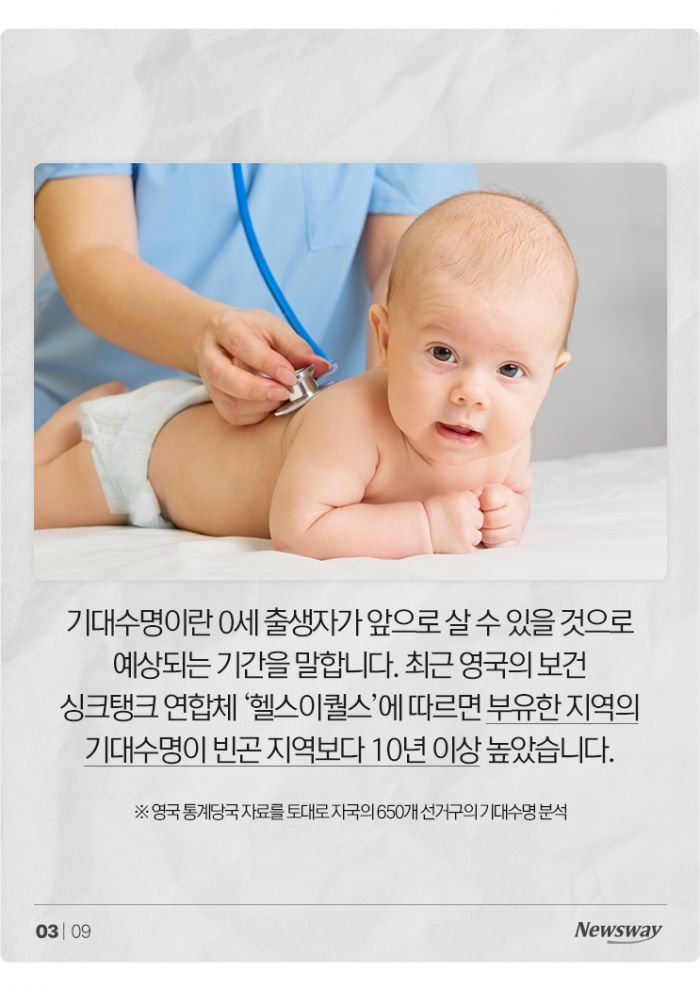 기대수명이란 0세 출생자가 앞으로 살 수 있을 것으로 예상되는 기간을 말합니다. 최근 영국의 보건 싱크탱크 연합체 '헬스이퀄스'에 따르면 부유한 지역의 기대수명이 빈곤 지역보다 10년 이상 높았습니다.