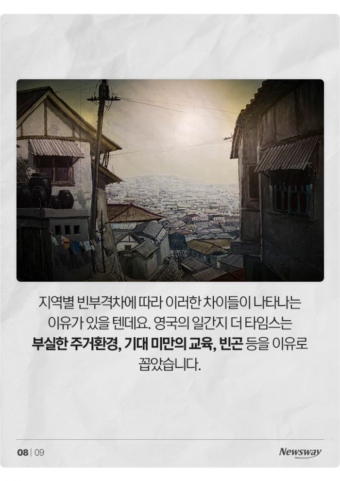 지역별 빈부격차에 따라 이러한 차이들이 나타나는 이유가 있을 텐데요. 영국의 일간지 더 타임스는 부실한 주거환경, 기대 미만의 교육, 빈곤 등을 이유로 꼽았습니다.