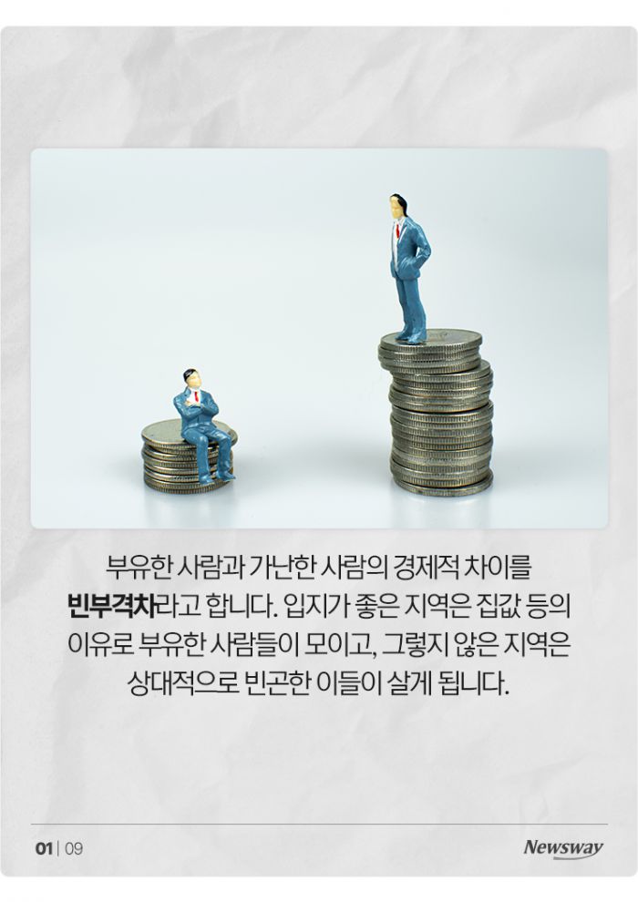 부유한 사람과 가난한 사람의 경제적 차이를 빈부격차라고 합니다. 입지가 좋은 지역은 집값 등의 이유로 부유한 사람들이 모이고, 그렇지 않은 지역은 상대적으로 빈곤한 이들이 살게 됩니다.
