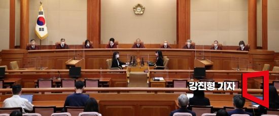 서울 종로구 헌법재판소에서 유남석 헌법재판소장이 헌법재판관들과 함께 자리하고 있다. 사진=강진형 기자aymsdream@ |