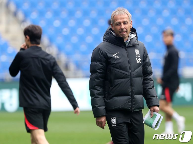 위르겐 클린스만 축구대표팀 감독이 콜롬비아와의 평가전을 하루 앞둔 23일 오후 울산 문수축구경기장에서 선수들의 훈련을 지켜보고 있다. 2023.3.23/뉴스1 ⓒ News1 이동해 기자 |