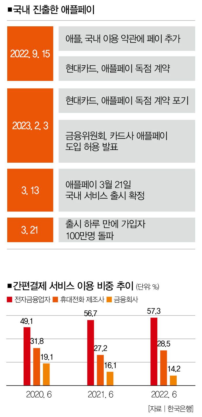 # 지난 21일 아이폰 사용자들이 환호성을 질렀다. 고대하던 애플페이가 드디어 국내 시장에 상륙했기 때문이다. 반응은 뜨거웠다. 정태영 현대카드 부회장은 출시 첫날 가입자 수가 100만명을 넘겼다고 알렸다. 애플 측이 "역대 최고 기록"이라고 평가했다는 말도 덧붙였다.