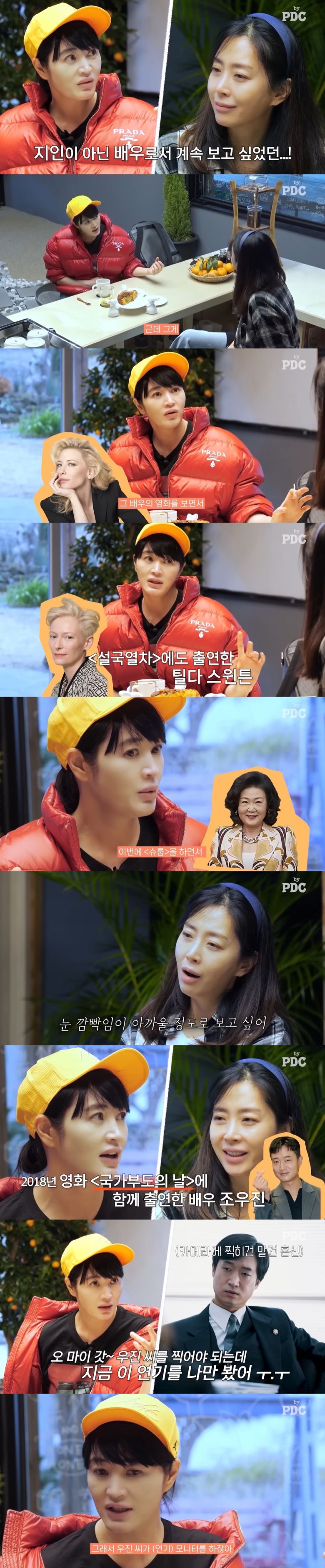 이어 "영화 '국가 부도의 날' 조우진씨가 너무 잘한다, 진중하고 점잖다"라며 "저와 연기할 때도 집중해서 찍다가도 조우진씨를 보면 나 혼자 보기 아까울 정도로 찍어야 하는 장면들이 많다, 이분이 모니터를 보는데 어깨라도 주물러주고 싶었다"라고 회상했다. 이에 송윤아도 "조우진씨 그런 배우 맞다"라고 맞장구쳤다.