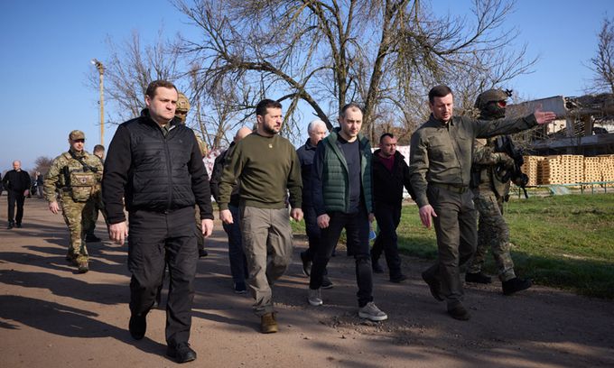 볼로디미르 젤렌스키 우크라이나 대통령이 23일(현지시간) 남부 헤르손 지역을 방문했다고 뉴욕타임스(NYT)가 보도했다. 전날 최대 격전지인 동부 바흐무트 인근 부대를 방문한 젤렌스키 대통령은 이틀 연속 최전선을 찾았다.