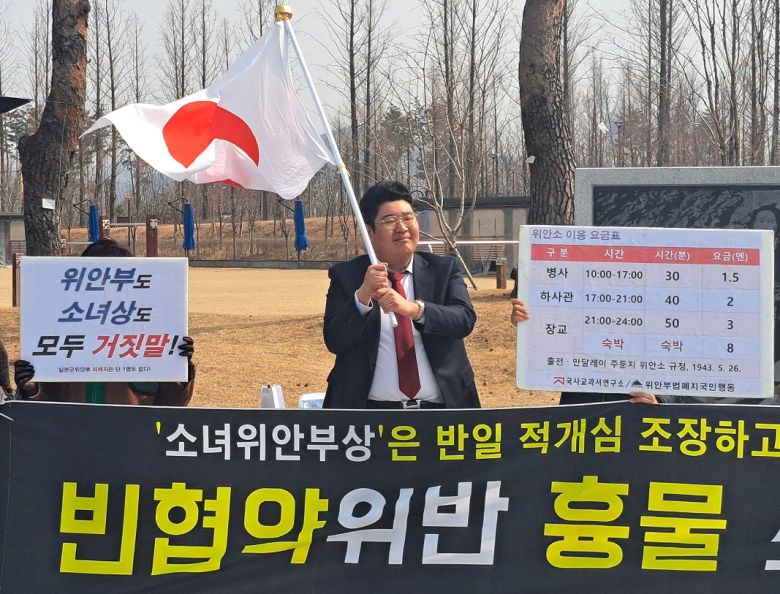 위안부법폐지국민행동 주최로 7일 세종호수공원 내 평화의 소녀상 앞에서 열린 소녀상 철거 촉구 집회에서 지난 3·1절에 세종시 한솔동 한 아파트 베란다에 일장기를 게양했던 시민이 일장기를 흔들고 있다. (연합뉴스)