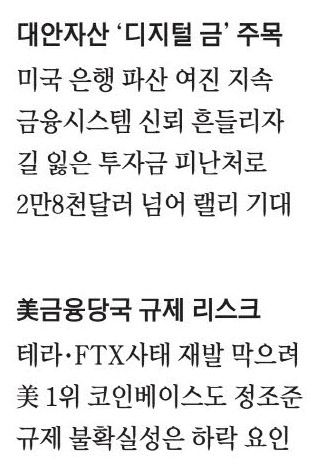 미국 은행 파산으로 금융 시장에 위기의식이 고조되고 미국의 금리 인상은 계속되는 환경 속에서 비트코인의 상승세가 눈에 띈다. 미국 긴축으로 자산 가격이 떨어질 것으로 예상되지만 비트코인은 이들의 대체자산으로 인식되고 금융 시스템 위기가 오더라도 비트코인은 대안자산으로서 역할을 할 것이라는 '쌍끌이 매력'이 상승 요인으로 꼽힌다. 이런 금융 시장의 불확실성은 당분간 지속될 것으로 예상돼 비트코인의 반사이익이 어디까지 진행될 수 있을지 투자자들의 관심이 모아지고 있다.