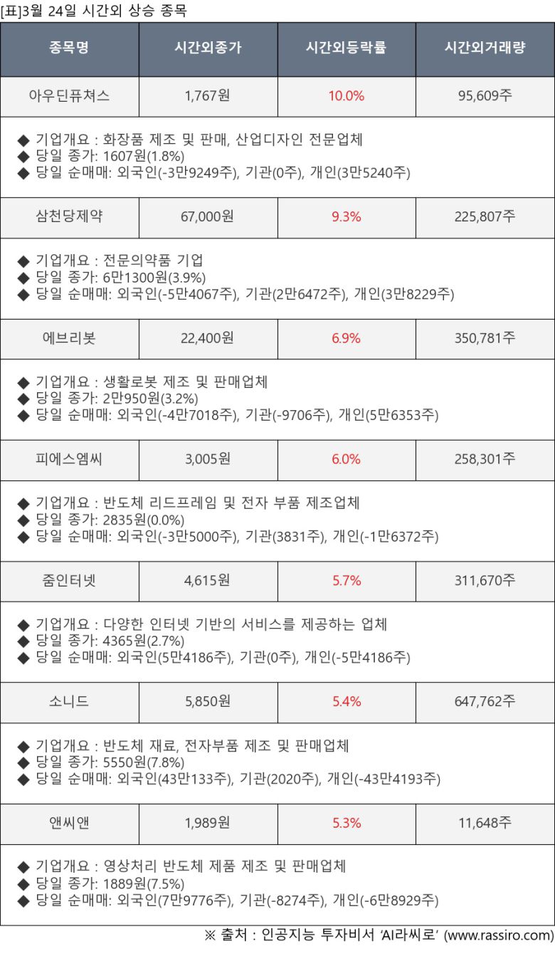 [서울=뉴스핌] 로보뉴스 = 3월 24일, 인공지능 투자비서 ‘AI라씨로’가 아우딘퓨쳐스(227610), 삼천당제약(000250) 등 시간외 단일가 매매 상승률 상위 종목들에 대한 최근 동향을 분석했다.
