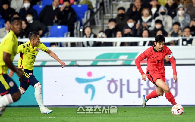 손흥민이 24일 울산문수축구경기장에서 열린 콜롬비아와 축구 국가대표 평가전에서 드리블을 하고 있다.
