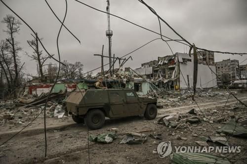 사진에는 우크라이나 동부 도네츠크 내 아우디우카시에서 폐허가 된 건물 옆을 우크라이나군의 전술 차량이 지나는 모습이 담겨 있다.
