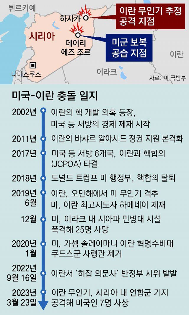 바이든 대통령은 취임 직후인 2021년 2월 이라크 내 미군기지가 이란의 지원을 받는 민병대의 로켓 공격을 받자 시리아 내 이란 연계 기지에 대한 공습을 단행한 바 있다. 또 지난해 8월에도 이란의 지원을 받는 무장단체의 공격으로 시리아 주둔 미군 3명이 부상을 당하자 폭격기를 동원해 시리아 내 이란 시설을 공습했다.