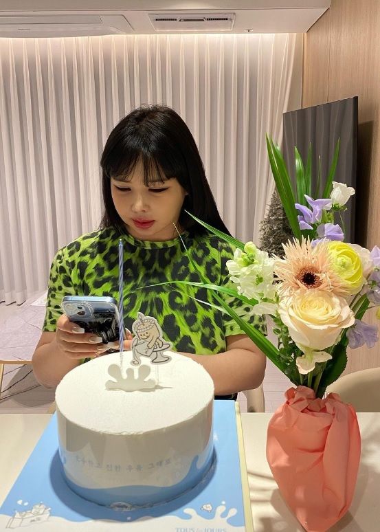 사진에는 형광색 호피 무늬 반팔 티셔츠를 입고 있는 박봄의 모습이 담겼다. 박봄의 앞에는 초 하나가 꽂혀있는 케이크가 놓여있다. 휴대폰을 보고 있는 박봄은 이전과 달라진 비주얼로 눈길을 끌었다.