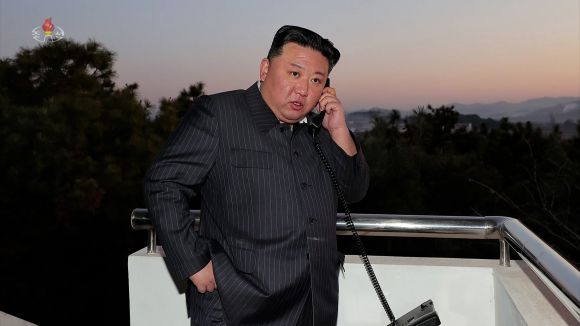ICBM ‘화성-17형’ 발사 승인하는 김정은 - 북한 김정은 국무위원장이 참관한 가운데 지난 16일 평양 국제공항에서 노동당 중앙군사위원회가 실시한 대륙간탄도미사일 화성포-17형 발사 영상을 조선중앙TV가 17일 공개했다. 김 위원장이 전화로 화성-17형 발사 승인을 하고 있다. 2023.3.17 조선중앙TV 화면 |
