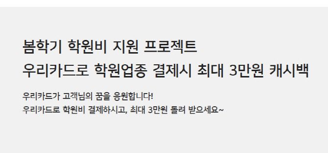우리카드는 이달 말까지 학원비를 우리카드로 결제시, 결제금액에 따라 캐시백해준다. 신용카드와 체크카드 모두 가능하다. 기간은 31일까지며, 이 기간 내 이벤트에 응모 후 학원 업종 합산 100만원 이상 이용시 최대 3만원 캐시백을 받을 수 있다. 가능 학원업종은 외국어ㆍ기능ㆍ컴퓨터ㆍ예체능ㆍ보습ㆍ학습지 등이며, 인터넷강의와 문화센터는 제외된다.