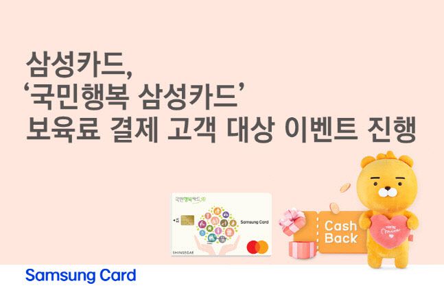 삼성카드는 어린이집 보육료를 캐시백해주는 이벤트를 진행중이다. ‘국민행복 삼성카드’로 3월과 4월에 어린이집 보육료를 결제한 고객을 대상으로 최대 1만원의 캐시백 혜택이 제공된다. 이벤트 응모 후 보육료를 10만원 이상 결제하고 보육료 외 1만원 이상을 결제한 고객은 월 5000원의 캐시백 혜택을 받을 수 있다.