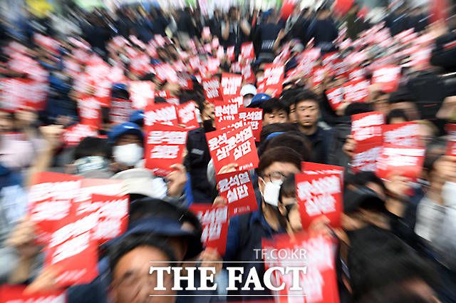 [더팩트ㅣ임영무 기자] 전국민주노동조합총연맹(민주노총)의 '민생파탄 검찰독재 윤석열 심판 투쟁선포대회'가 25일 오후 서울 종로구 이화사거리에서 열린 가운데 집회 참가자들이 피켓을 들고 구호를 외치고 있다.