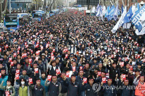 (서울=연합뉴스) 홍해인 기자 = 민주노총 주최로 25일 서울 종로구 대학로 일대에서 '민생파탄·검찰독재 윤석열 심판 투쟁선포대회' 가 열리고 있다. 2023.3.25 [공동취재]